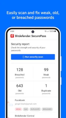 Bitdefender SecurePass 不仅提供固若金汤的防护,更是您智能管理数字生活的好帮手。其内置的强大密码生成器能一键创建复杂且难以破解的独特密码,同时,强度顾问会实时评估您现有密码的安全性,及时提示潜在风险。无论您身处何地,使用何种设备,Bitdefender SecurePass 都能在 Android、iOS、Windows、macOS 以及 Chrome、Firefox 等各大浏览器间实现无缝同步,确保您的密码库随时随地触手可及。此外,它持续监控数据泄露事件,一旦您的凭证面临曝光风险,Bitdefender SecurePass 将立即发出警报,助您在威胁扩散前采取行动,还支持安全加密分享功能,让您能与信任的亲友或同事安全共享所需凭证。